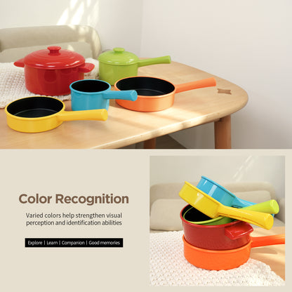- Kitchen playset toy set include colorful play pots and pans with lid and handles, utensils, egg, cabbage, carrot, chili pepper, kiwi, water melon, eggplant, fish, crab, knife and chopping board.