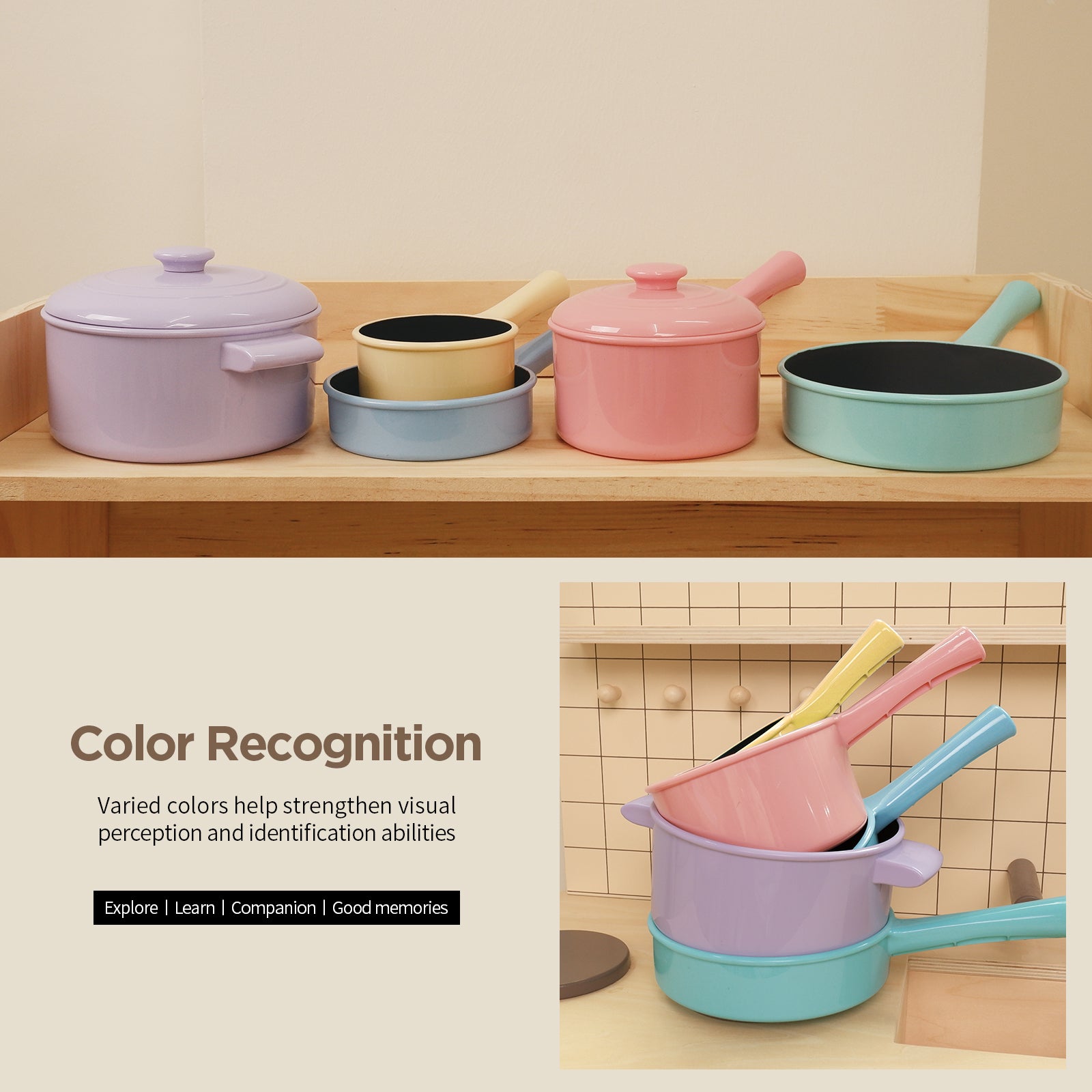 · Kitchen playset toy set include colorful play pots and pans with lid and handles, utensils, egg, cabbage, carrot, chili pepper, kiwi, water melon, eggplant, fish, crab, knife and chopping board.