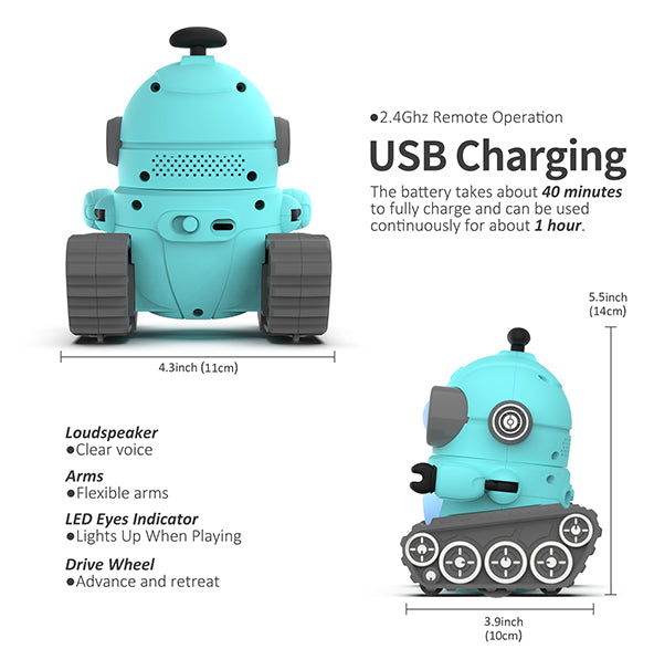 - Unique Design: The robot toy is designed in 2 parts. The upper part is a cute robot with LED eyes and flexible head and arms, which can make different postures. The bottom part is designed as track of a tank, which can slide left and right and rotate 360° in place.